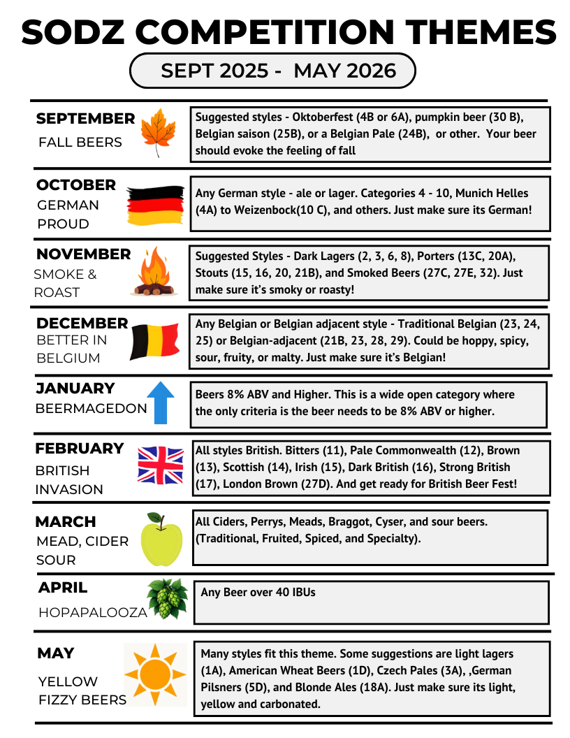 From September to May, SODZ hosts themed club competitions at our monthly meetings. These casual competitions are open to all paid members, and we encourage you to bring one or more beers, ciders, or meads that fit the month’s theme. Registration is free and is done on-site; simply bring a bottle, can, or growler for each entry.